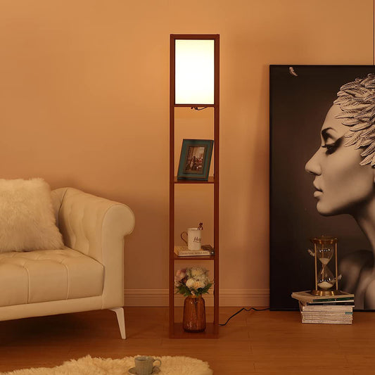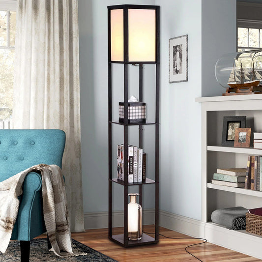 Modern LED Shelf Floor Lamp Black Wooden Skinny End Table Nightstand